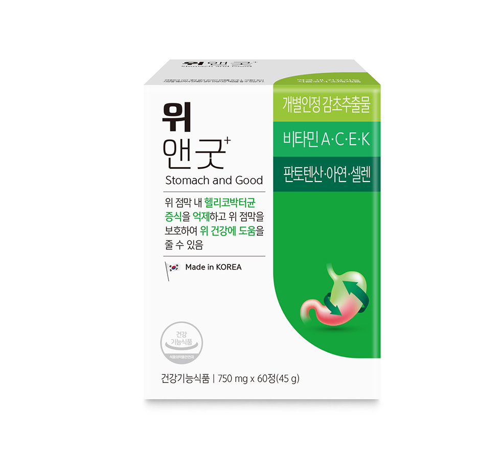 ‘위앤굿’은 식품의약품안전처로부터 항헬리코박터 및 위 점막 보호 기능성을 인정받은 개별인정형 원료인 감초추출물이 주성분으로 위건강은 물론 항헬리코박터 기능까지 인정받은 원료는 감초추출물이 유일하다. 위앤굿에 함유된 감초추출물은 임상시험을 통해 기능성 소화불량 개선 및 항헬리코박터 작용에 대한 유의미한 데이터를 확보했으며, 저용량(타 제품대비 1/10수준)으로 더 우수한 효능이 있다.