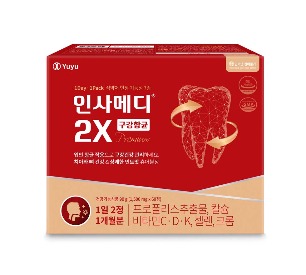 유유제약이 식약처로부터 ‘구강항균’ 기능성을 인정받은 건강기능식품 `인사메디2X 구강항균` 을 출시했다. 프로폴리스•비타민•미네랄을 함유한 건강기능식품 중 ‘구강항균’ 기능성을 국내 최초로 인정받았다.