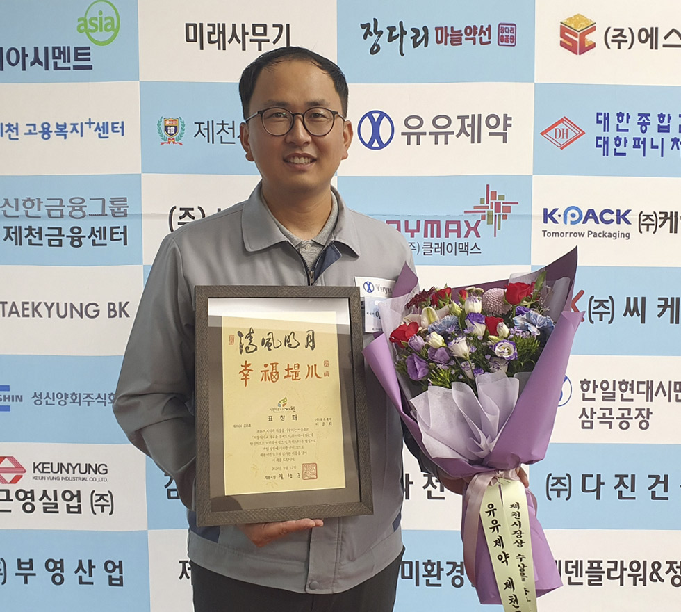 유유제약 공장관리팀 이준희 매니저가 제2회 제천시 기업인의 날 시상식에서 모범근로자로 선정돼 제천시장상을 수상했다.