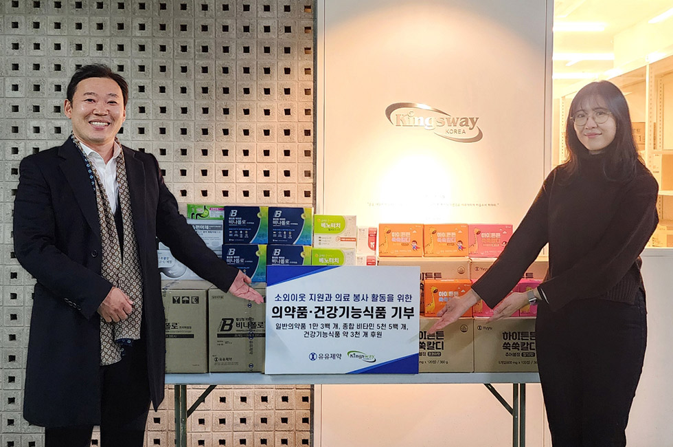 유유제약은 비나폴로프리미엄정, 베노터치힐러플라스타, 유판씨멀티구미, 모두앤굿 등 일반의약품 및 건강기능식품 총 9종을 비영리 NGO 킹스웨이코리아, 지파운데이션, 서울드림교회 등 3곳의 단체에 기부했다. 유유제약이 기부한 제품들은 각 NGO 단체를 통해 소외이웃 지원과 의료 봉사 활동에 활용될 예정이다.