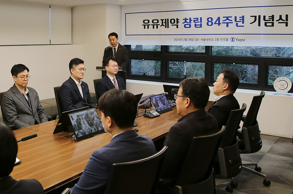 유유제약이 28일 서울 사무소와 제천 공장, 광교 연구소 및 전국 영업지점을 화상으로 연결해 창립 84주년 기념식을 진행했다.