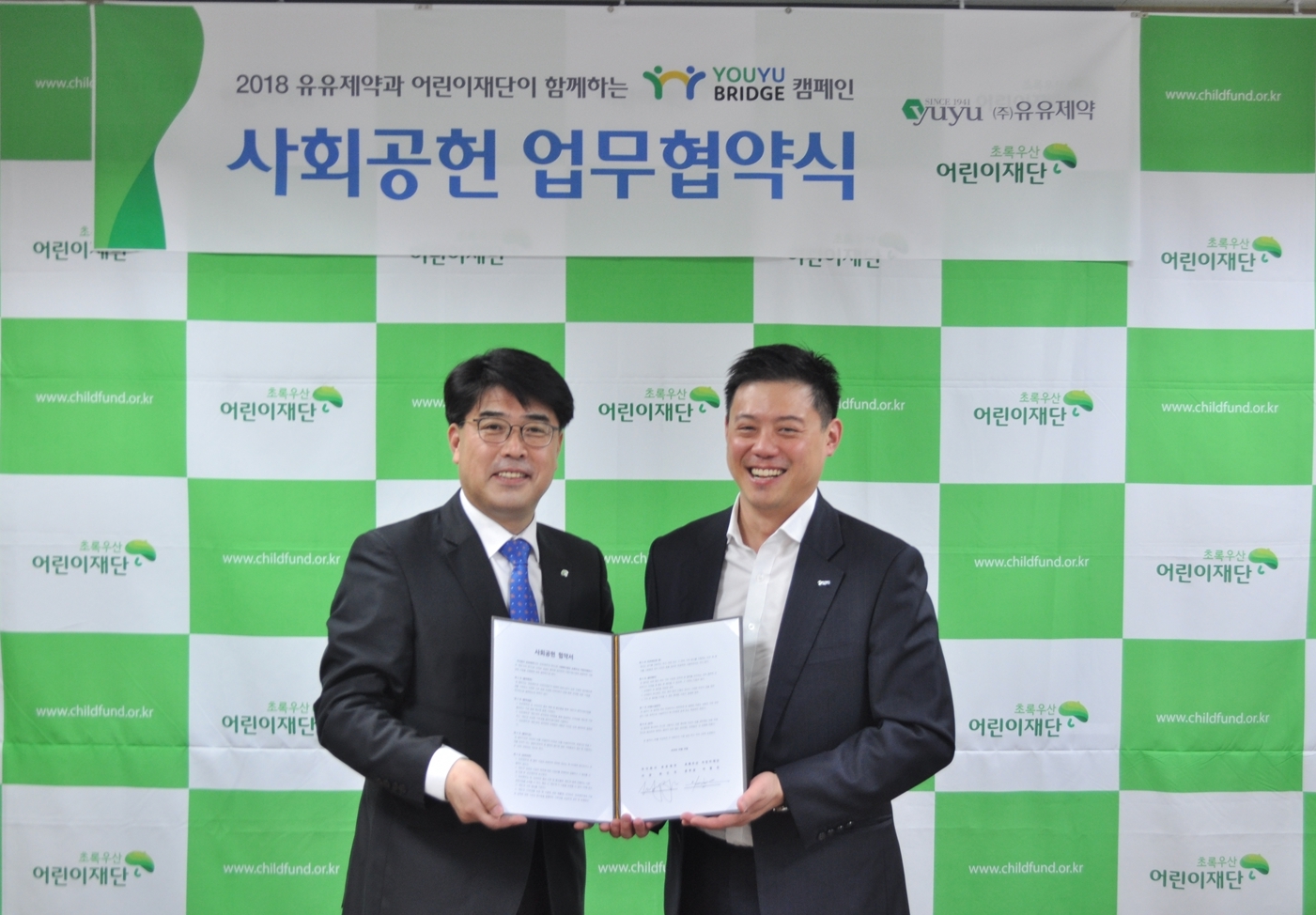 유유제약이 글로벌아동복지대표기관 초록우산어린이재단과 환아복 지원을 위한 기업 사회공헌 캠페인 ‘Youyu Bridge’진행에 대한 MOU를 체결했다.