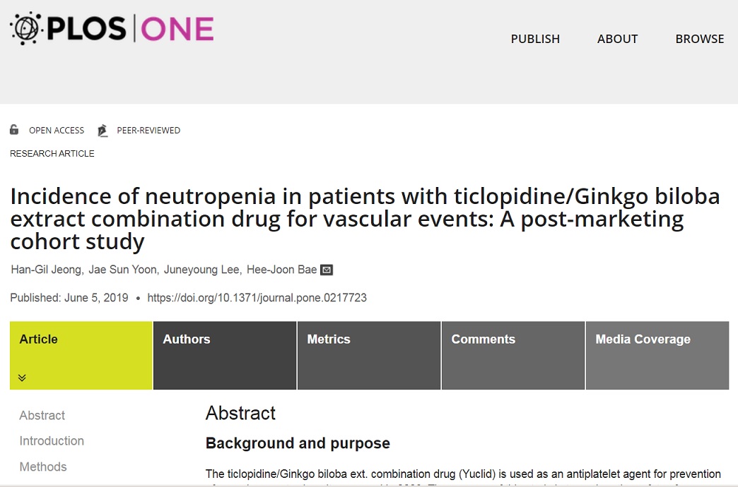 이번 연구는 유크리드(티클로피딘+은행엽엑스)를 1회 이상 복용한 혈관성 질환 환자 4,839명을 대상으로 호중구 감소증, 출혈 등 모든 이상반응 발생률을 측정하여 안전성을 입증하기 위해 진행됐다.