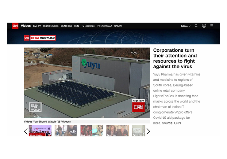 미국의 24시간 뉴스 전문채널인 CNN은 “Impact Your World”라는 기획코너를 통해 코로나 바이러스에 맞서는 전세계의 다양한 모습들을 연속 보도하고 있다. 유유제약은 중국의 온라인쇼핑몰 ‘Light in the Box’, 인도의 IT기업 ‘Wipro’와 함께 코로나 바이러스 사회공헌활동을 펼친 아시아 기업 중 하나로 소개됐다.