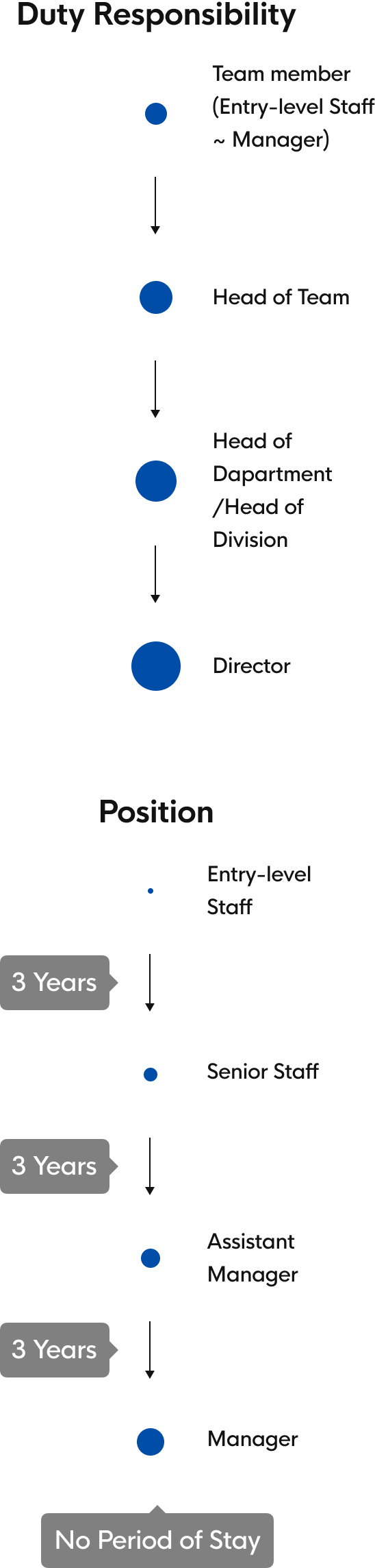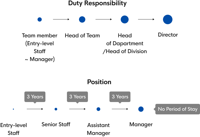 For building a flexible & fast organizational structure, a corporate culture where the freedom of opinions and expressions is valued, and a performance-oriented organization, we use the open position system that integrates the organizational structure hierarchies, but separates titles.