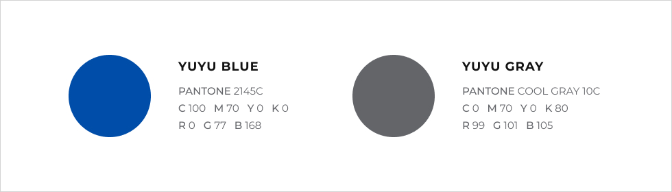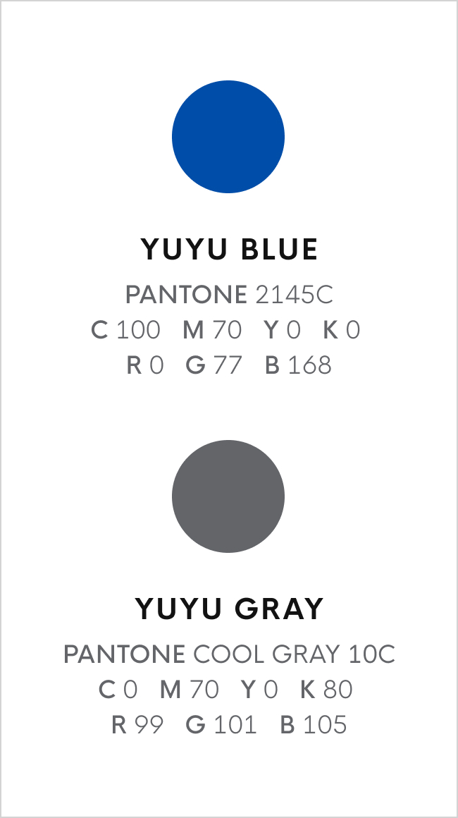 The top representative colors are YUYU BLUE, YUYU GRAY, and the designated Pantone 2145C / COOL GRAY 10C is applied.
