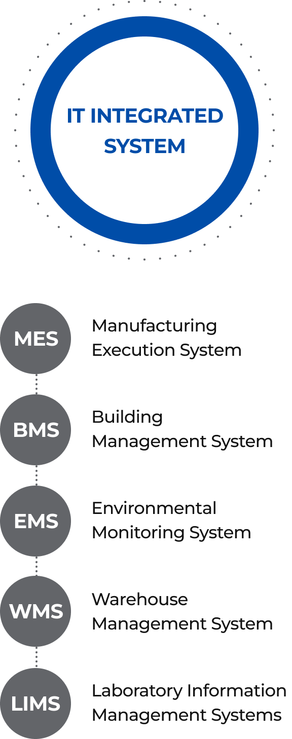 Through the integration of IT systems such as MES, LIMS, BMS, EMS, and WMS, efficient drug manufacturing production is carried out.