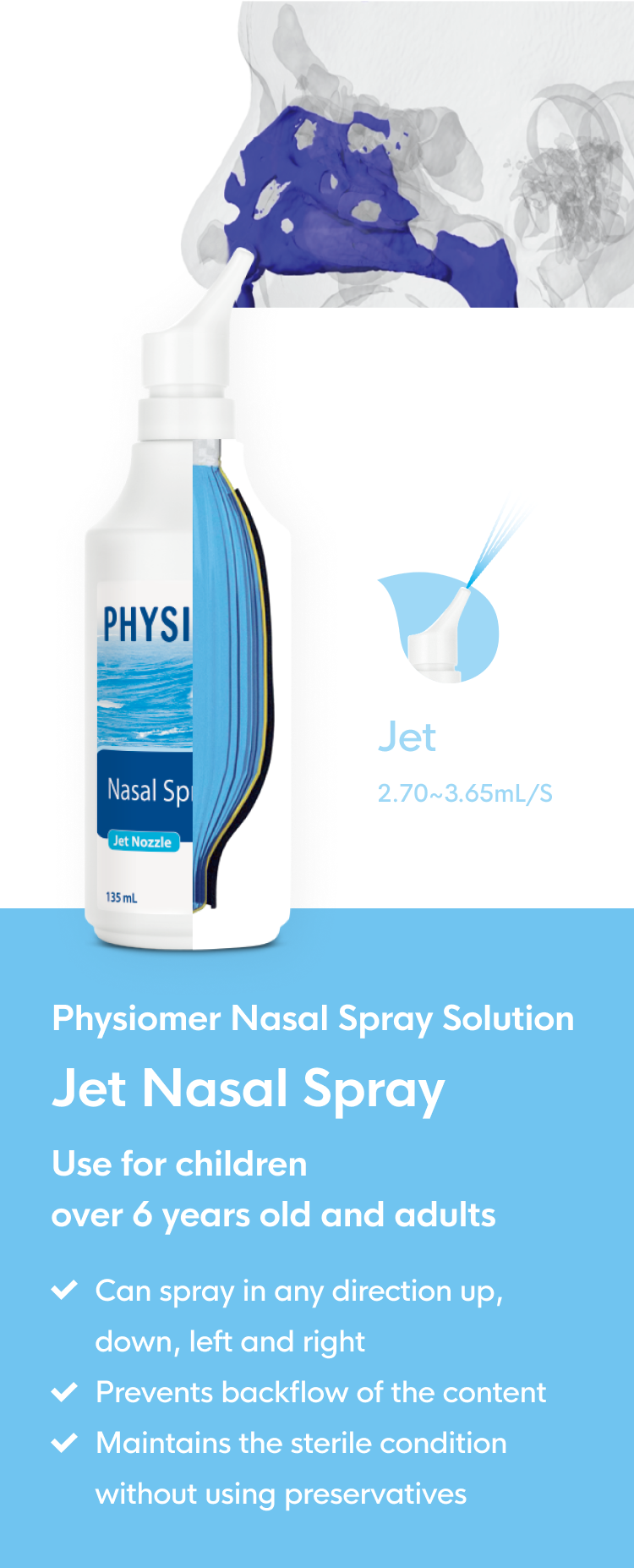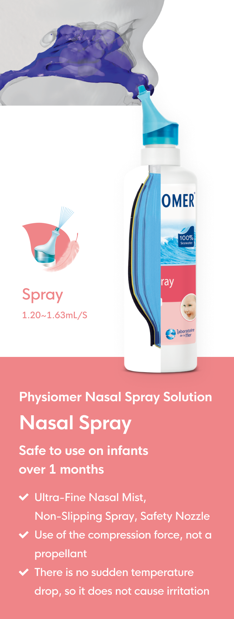 The brand name, PHYSIOMER, is the combination of the English word "Physiological" in English, which is the branch of biology dealing with the functions and activities of living organisms and their parts, and the French word “Mer”, which means sea in English. Physiomer contains the meaning of beneficial effects on the human body through minerals in seawater. For over 30 years, the brand has kept its stubborn promise that it uses 100% undiluted seawater, and does not contain preservatives or chemical additives. Physiomer product line has various nasal care products intended for use by consumers of all ages.