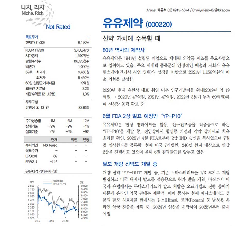 IBK투자증권 채윤석 연구원에 따르면 유유제약은 80년 역사의 제약사로 오너 3세 유원상 대표 취임 이후 연구개발비를 확대하며 올해 6월 美 FDA 임상 2상 결과 발표를 앞두고 있는 안구건조증 치료제 YP-P10, 탈모 치료 개량신약인 YY-DUT 등 신성장 동력을 확보 중이다.