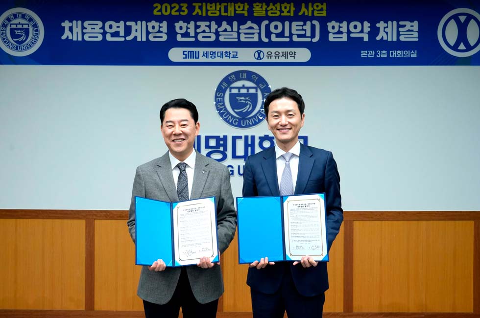 유유제약이 충북 제천에 소재한 세명대학교와 채용 연계형 현장실습 운영을 위한 산학협력 협약식을 체결했다.
