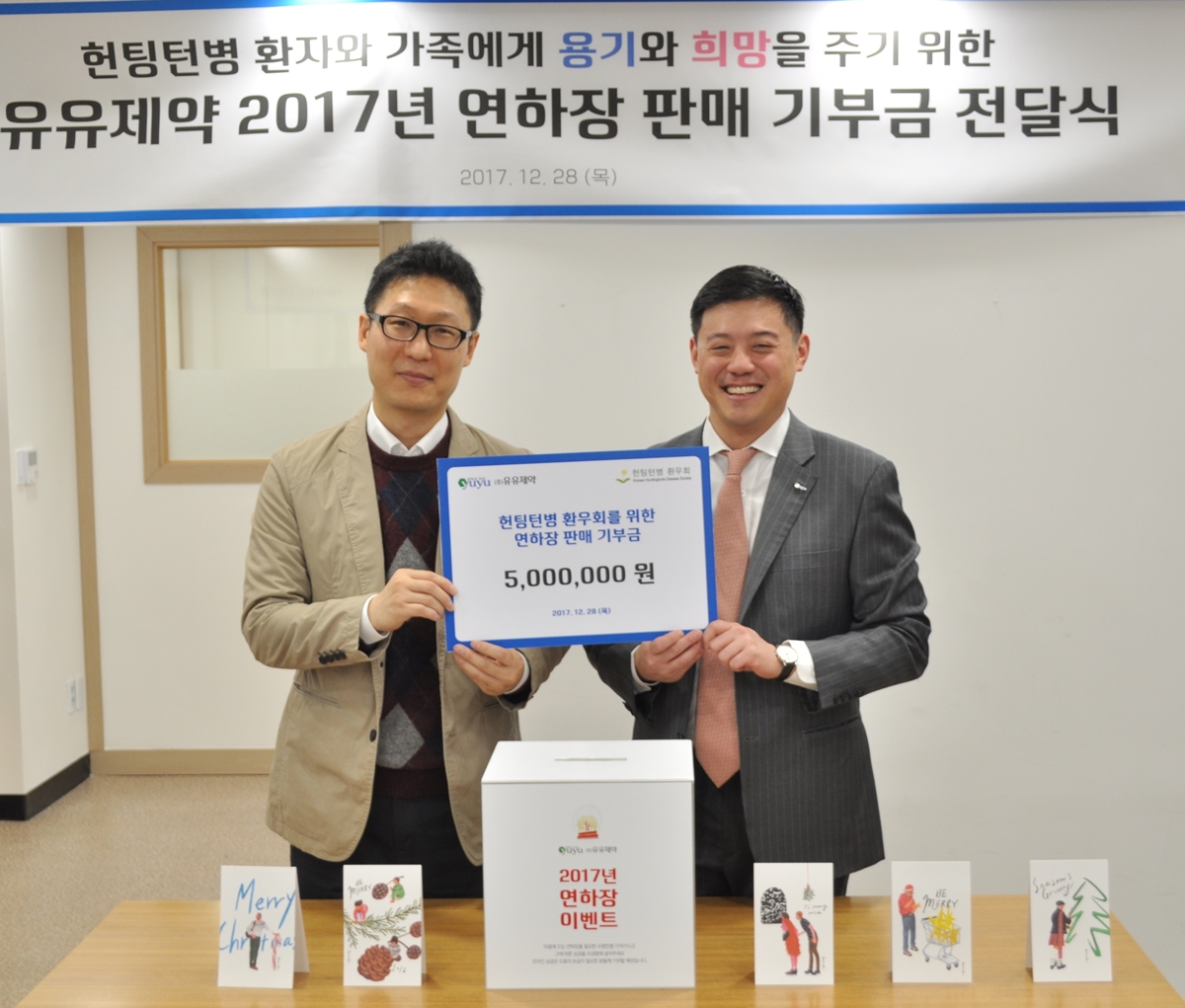유유제약이 연말연시 이웃과 함께 하는 사회공헌활동의 일환으로 임직원 대상 연하장 판매금 및 회사 지원액을 더한 매칭펀드 모금액을 희귀병의 일종인 헌팅턴병 환우회에 기부했다.